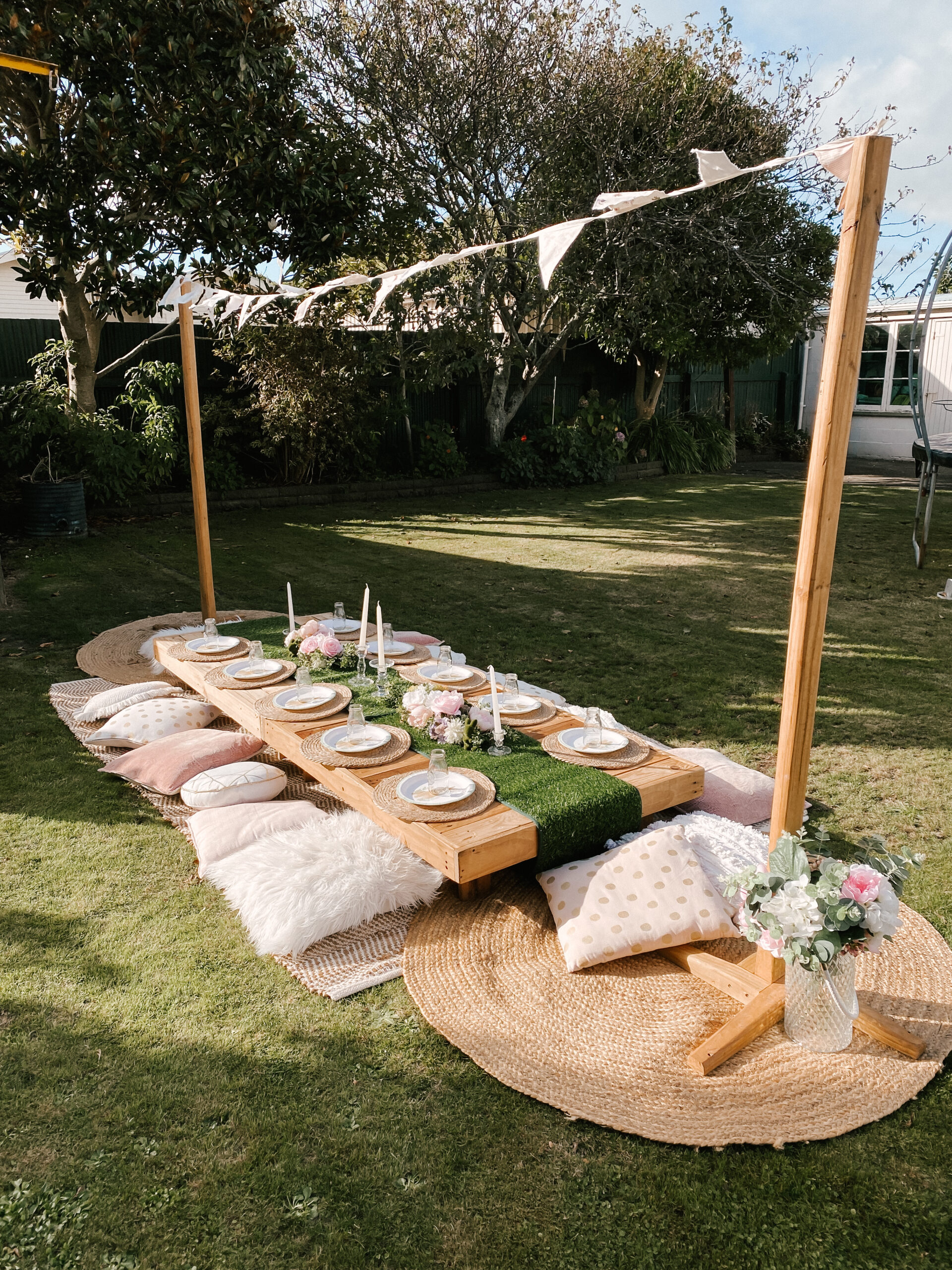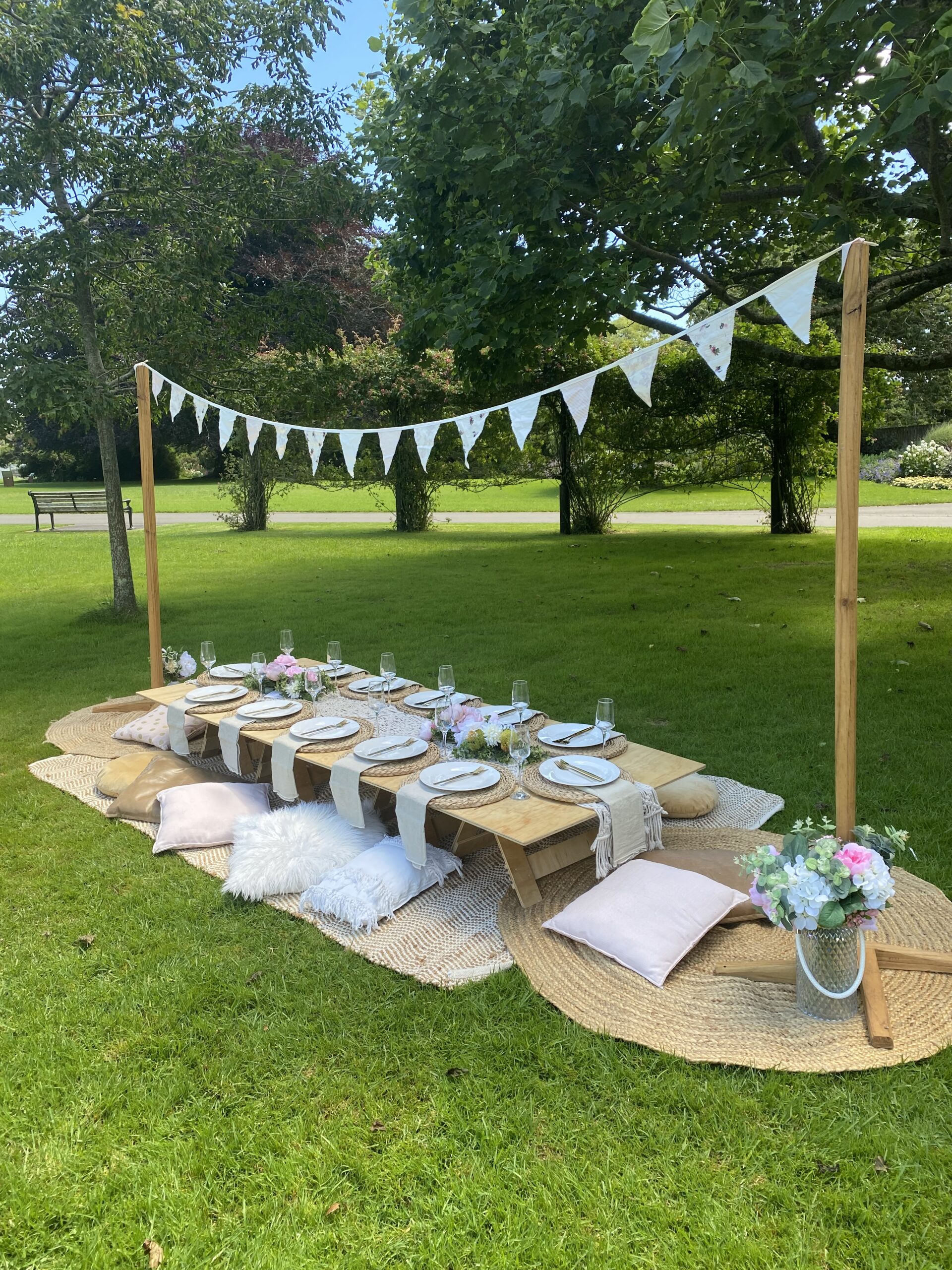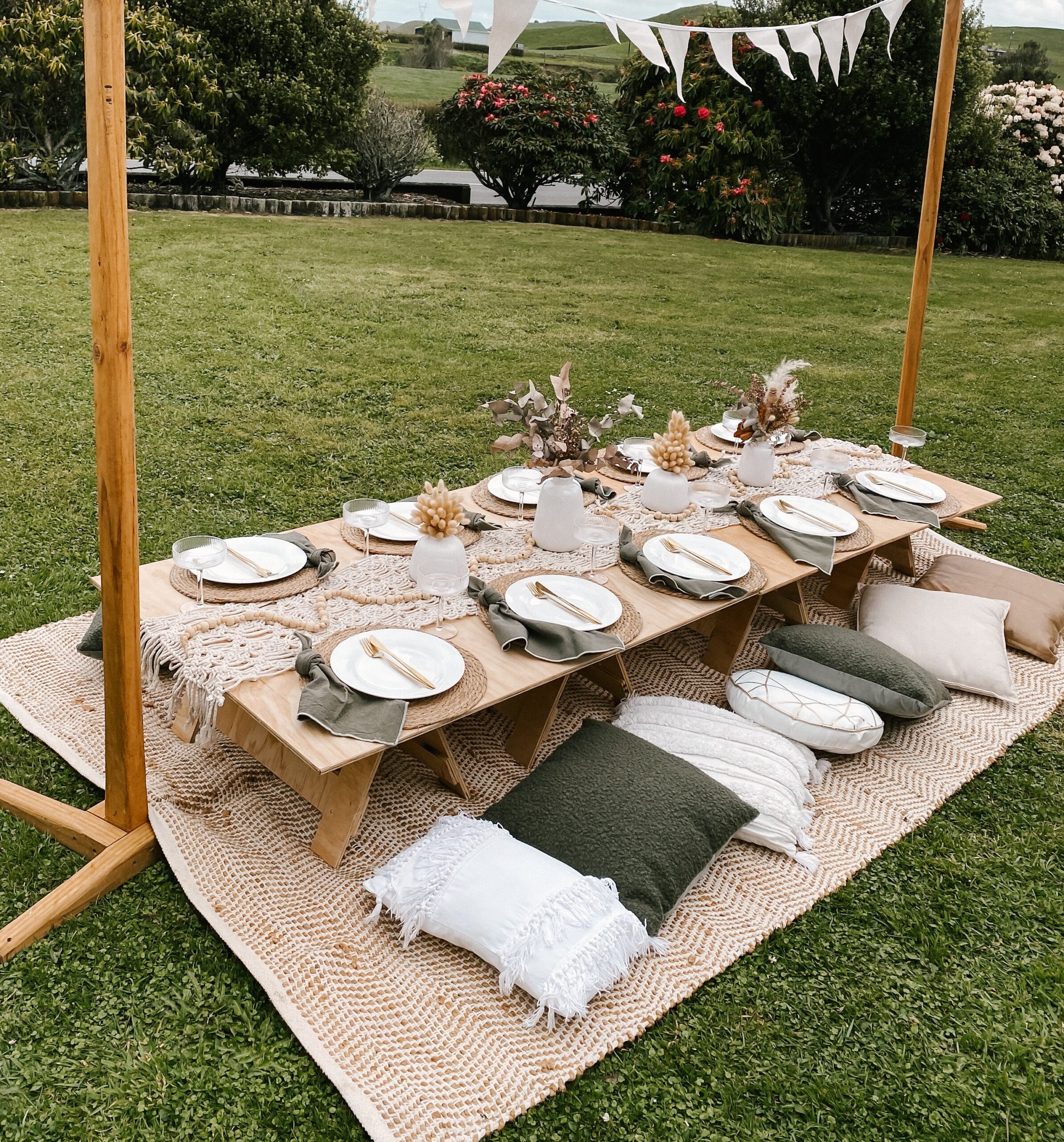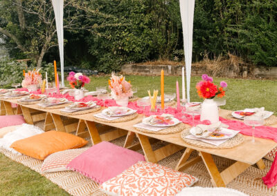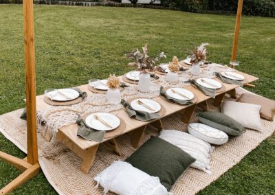 Pretty and whimsy, gorgeous florals adorn our sleek low wooden tables. With pale pinks and plenty of neutrals, this picnic party setup is breathtakingly beautiful. Perfect for so many occasions, think birthday party, bridal shower, baby shower or a get-together with the girls! Any excuse will do!