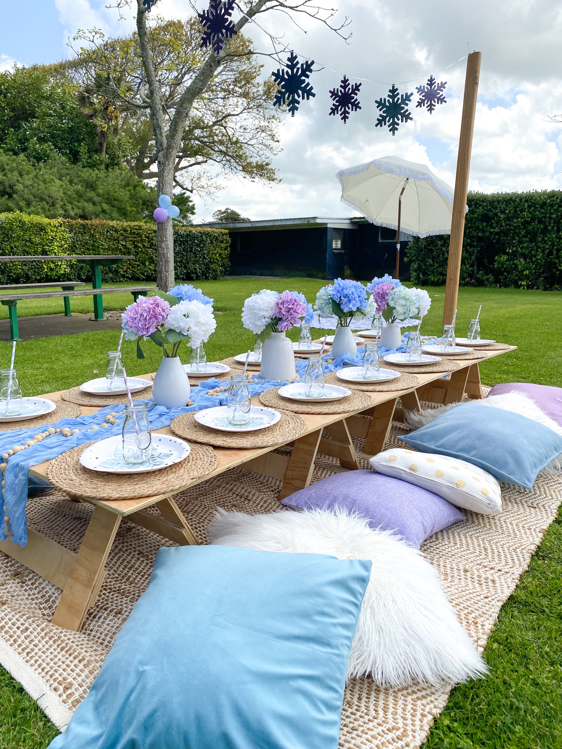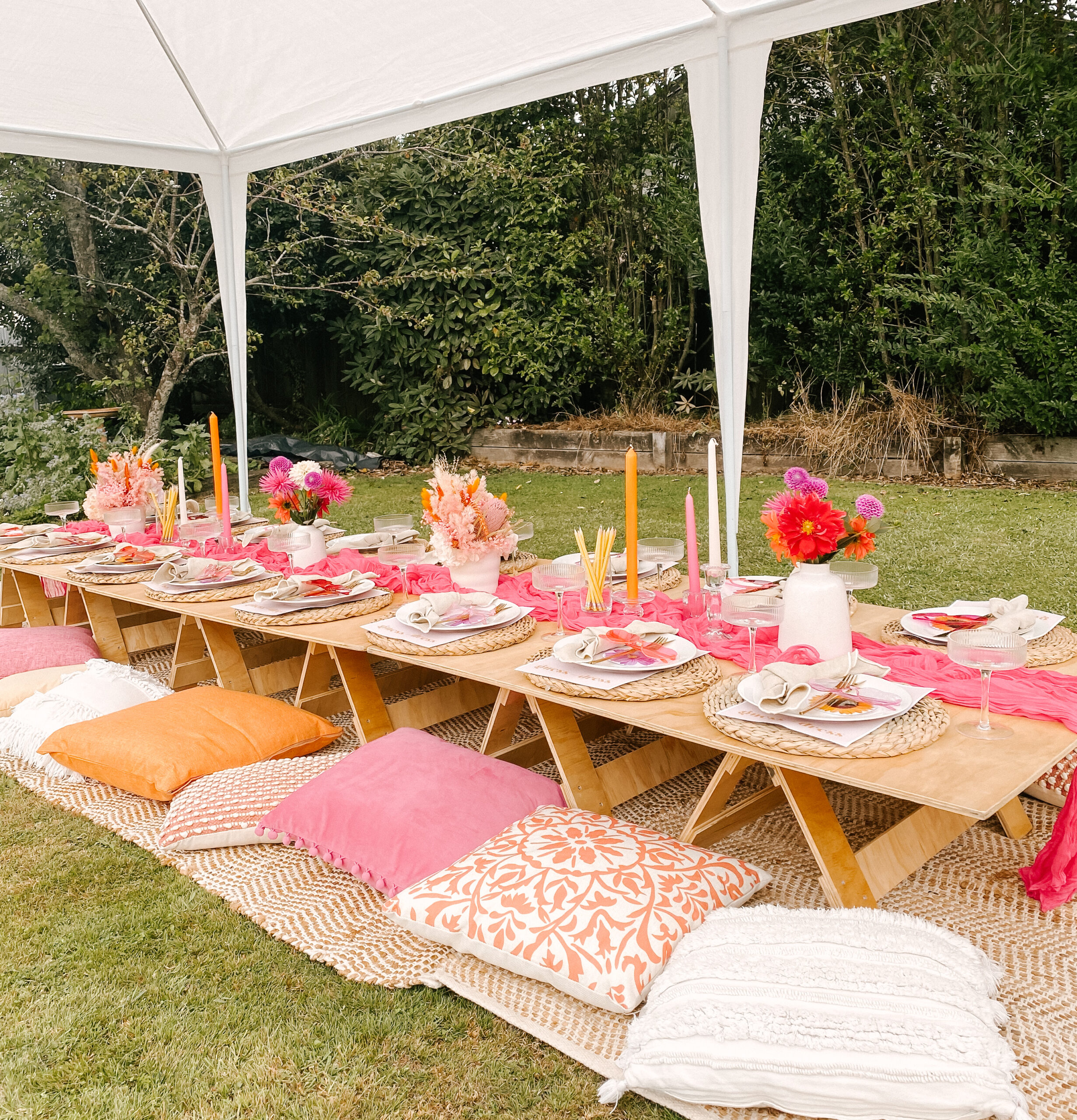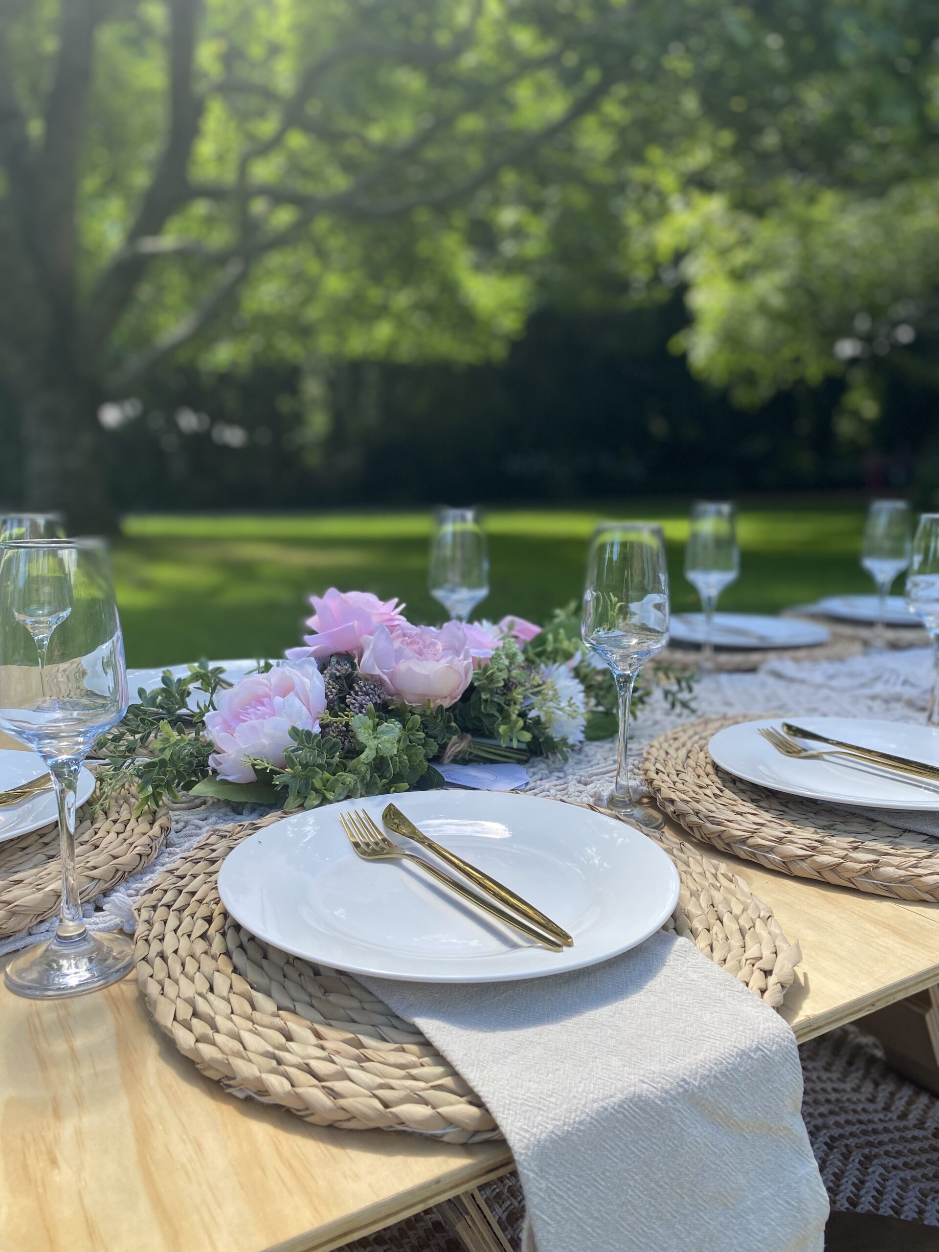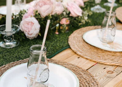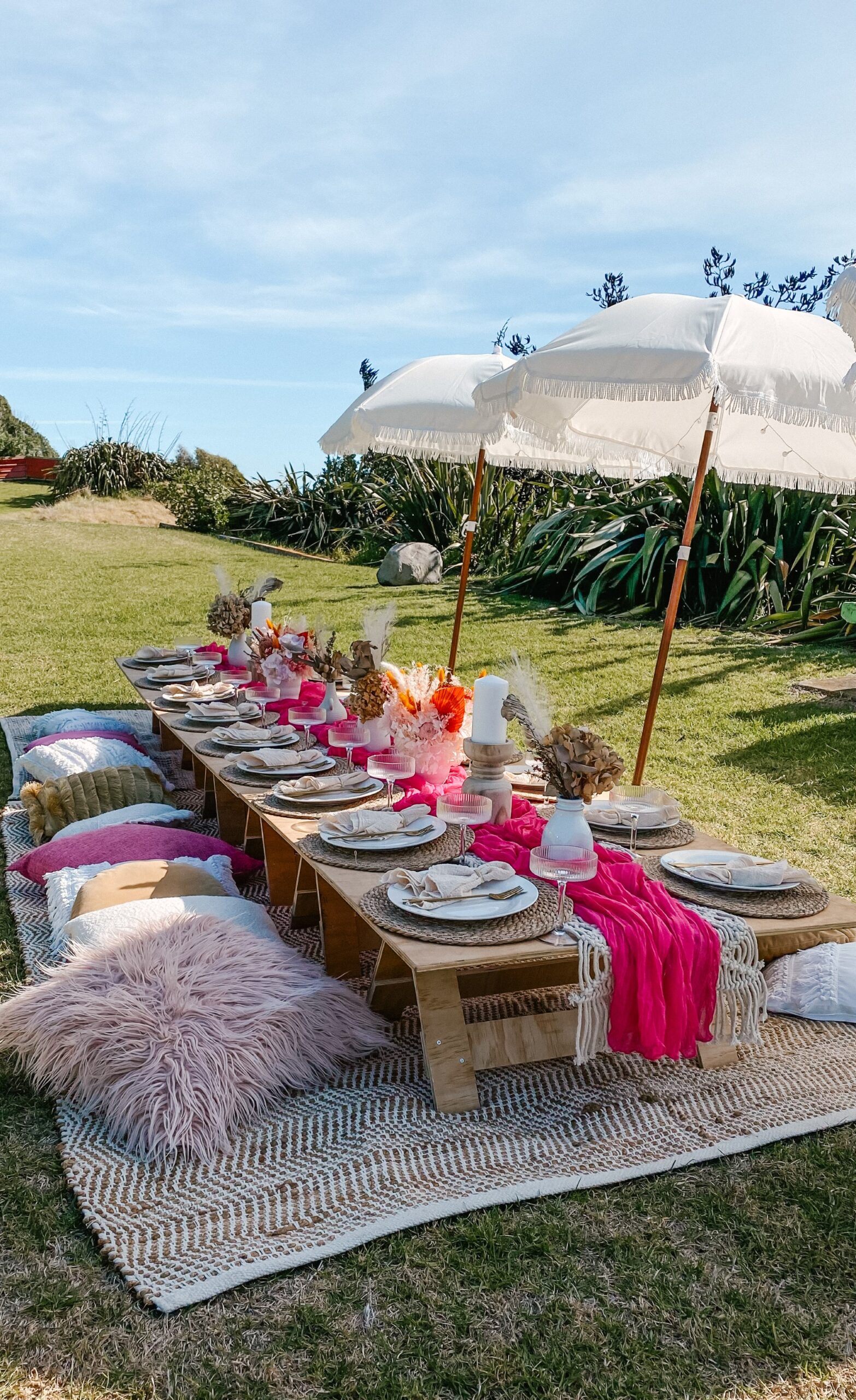 Pretty and whimsy, gorgeous florals adorn our sleek low wooden tables. With pale pinks and plenty of neutrals, this picnic party setup is breathtakingly beautiful. Perfect for so many occasions, think birthday party, bridal shower, baby shower or a get-together with the girls! Any excuse will do!