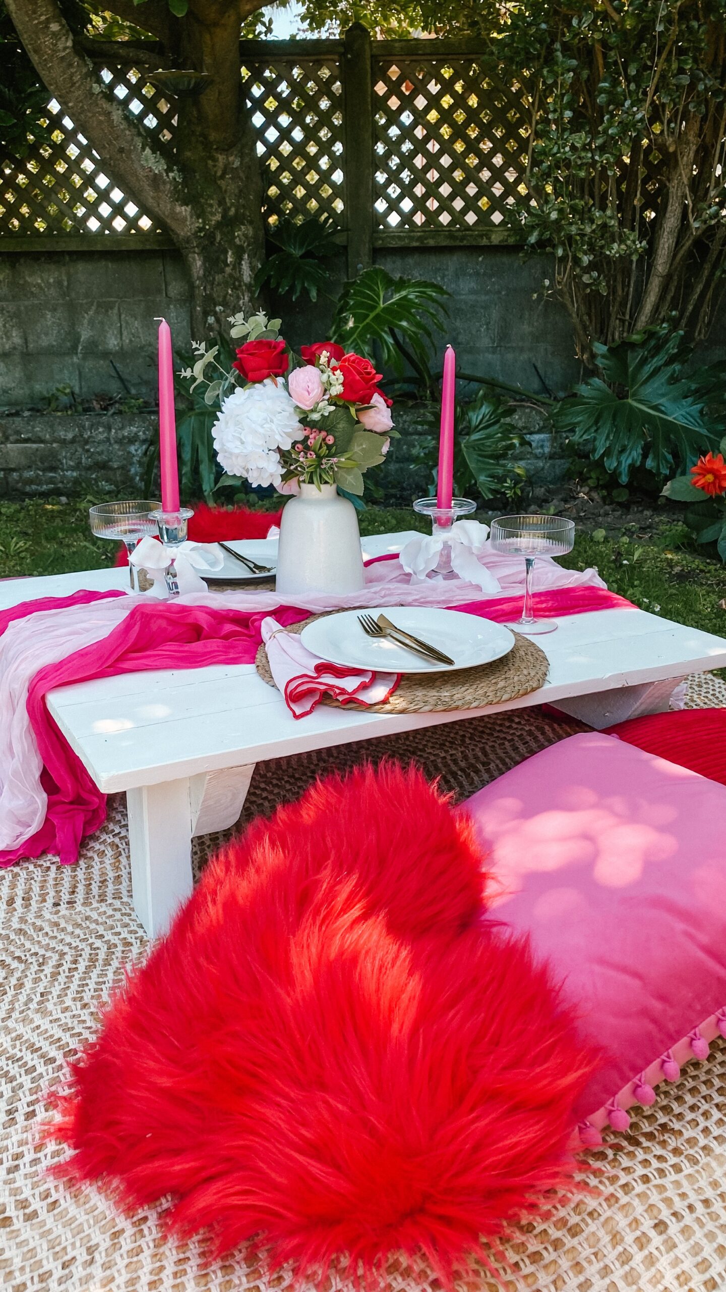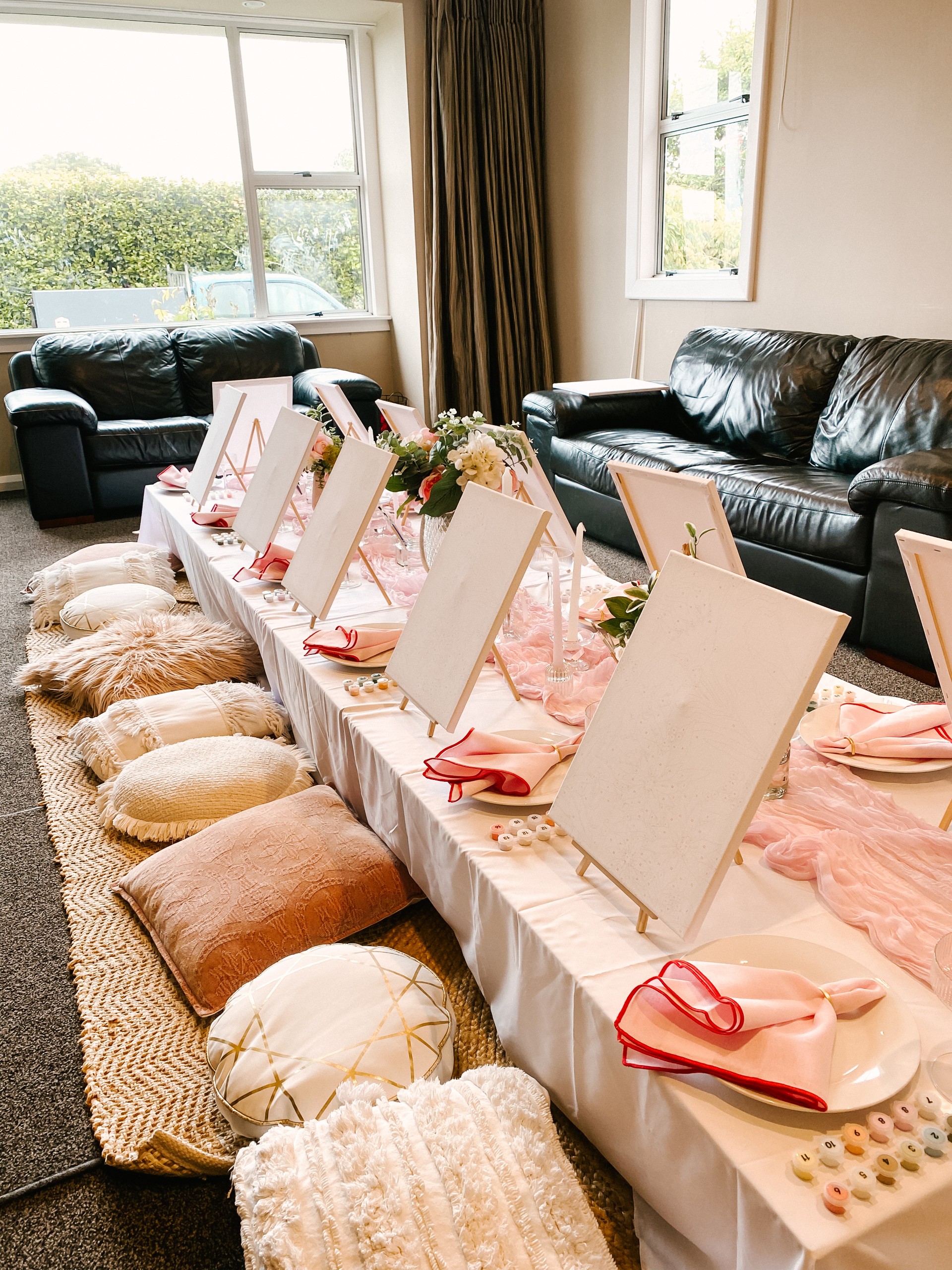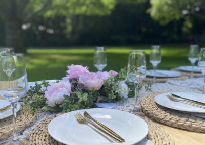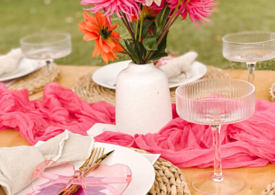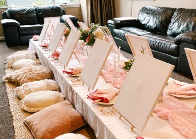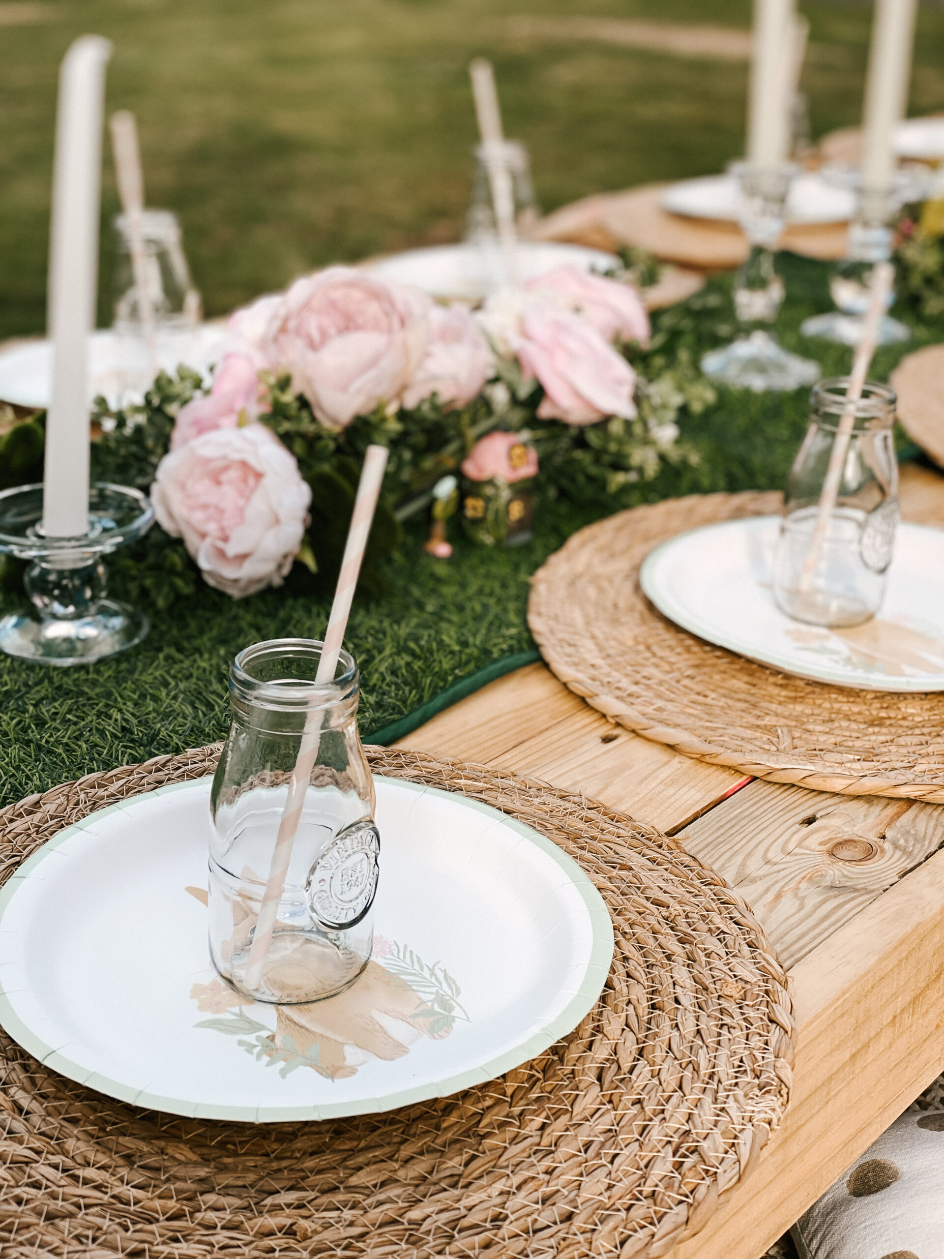 Pretty and whimsy, gorgeous florals adorn our sleek low wooden tables. With pale pinks and plenty of neutrals, this picnic party setup is breathtakingly beautiful. Perfect for so many occasions, think birthday party, bridal shower, baby shower or a get-together with the girls! Any excuse will do!